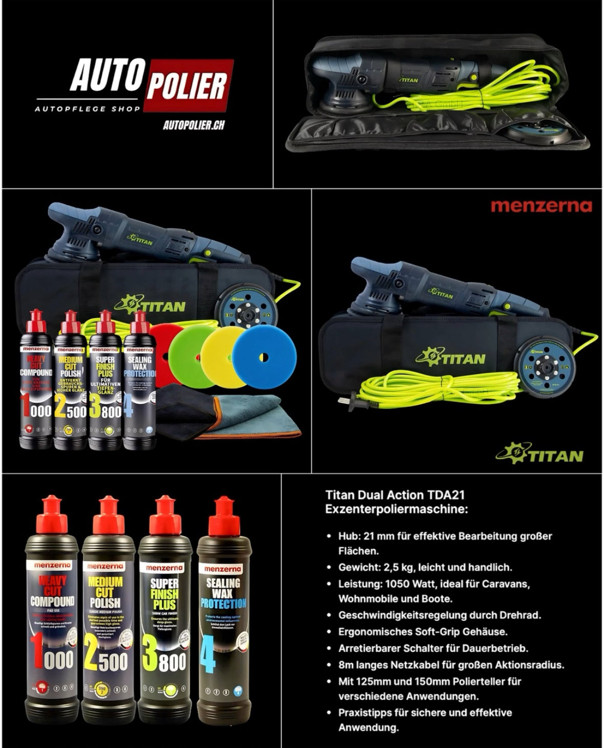 Titan Exzenter Poliermaschine TDA21 im Luxus Set 4 x Menzerna Politur 4 x Polierschwamm