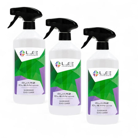 Das Produkt von Liquid Elements Quarz Clean Nano, einen hochwertigen Glasreiniger mit Versiegelung, hergestellt in Deutschland, der leicht und effektiv leichte Verschmutzungen von Scheiben entfernt.