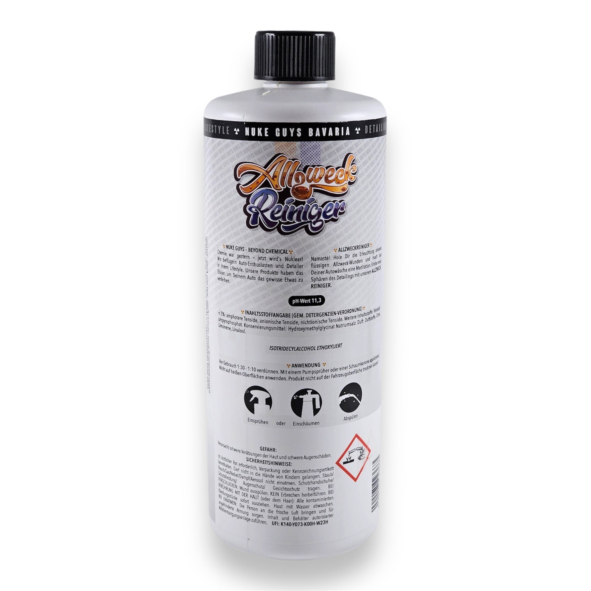 Le nettoyant tout usage Nuke Guys se présente comme une solution de nettoyage extrêmement concentrée, sans phosphates ni solvants. Grâce à la combinaison soigneusement sélectionnée de tensioactifs et à la composition puissante, ce nettoyant alcalin est extrêmement efficace lorsqu'il s'agit d'éliminer rapidement et en profondeur même les saletés les plus tenaces telles que les huiles, les graisses, les contaminations environnementales et les saletés de la route.